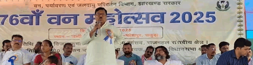 वन पर्यावरण एवं जलवायु परिवर्तन विभाग की ओर से महेशपुर प्रखंड के जब्दी खरियोपाड़ा में 76 वां वनमहोत्सव पर कार्यक्रम आयोजित किया गया।कार्यक्रम का शुभारंभ दीप प्रज्वलित कर किया गया। सांसद विजय हांसदा ने कहा कि वन महोत्सव हर साल मनाते आ रहे हैं। इस बार भी 76 वां वन महोत्सव मनाया जा रहा हैं। पेड़ लगाने से क्या फायदे मिलते हैं पहले इसकी जानकारी होना चाहिए। एक पेड़ कटेगा तो दस पेड़ लगाने का काम किया जा रहा है। प्राकृतिक से छेड़छाड़ करने से आज बहुत सारी समस्या हो रही है। लोग जिस तरह अन्य त्योहार मनाते है उसी तरह वन महोत्सव को भी मनाना चाहिए। आजकल लोगों को शुद्ध आँक्सीजन नहीं मिल पा रहा है। सिर्फ सरकारी भूमि में नहीं बल्कि अपने अपने जमीन पर भी पेड़ लगाएं। विधायक प्रोफेसर स्टीफन मरांडी ने कहा कि क्षेत्र के जंगल को सुरक्षित रखें। पेड़ लगाएं, काटे नहीं। एक-एक पेड़ घर के सदस्यों के तरह है। सुरक्षा और रक्षा करना हम सभी का दायित्व ही नहीं कर्तव्य है। पर्यावरण का संरक्षित रहना नितांत आवश्यक है, हम सबका कर्तव्य है।कार्यक्रम को संबोधित करते हुए उपायुक्त मनीष कुमार ने बताया कि एक पेड़ मां के नाम अभियान एवं प्रोजेक्ट प्रकृति के तहत पाकुड़ जिले में अब तक पाकुड़ जिले में 37 हजार से अधिक पौधे प्रोजेक्ट प्राकृति के तहत लगाये जा चुके हैं।