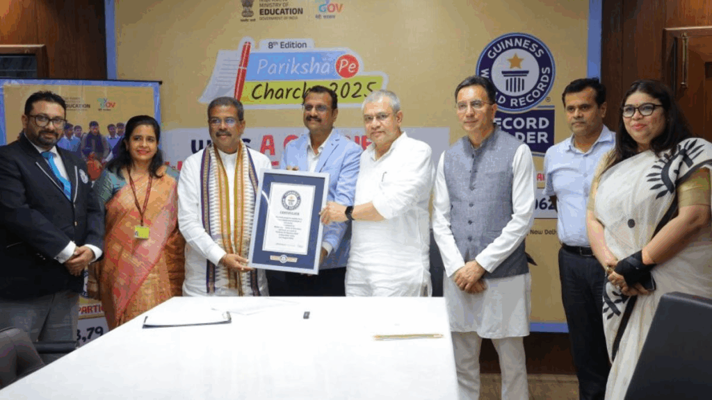 प्रधानमंत्री नरेंद्र मोदी की खास पहल ‘परीक्षा पे चर्चा 2025’ ने इतिहास रच दिया है। इस कार्यक्रम का नाम अब गिनीज वर्ल्ड रिकॉर्ड्स में दर्ज हो गया है। दिल्ली में आयोजित एक कार्यक्रम में गिनीज बुक ऑफ वर्ल्ड रिकॉर्ड्स ने यह प्रमाणपत्र सौंपा। ‘परीक्षा पे चर्चा 2025’ को सिर्फ एक महीने में 3 करोड़ 53 लाख से अधिक रजिस्ट्रेशन मिले, जो अब तक का सबसे बड़ा आंकड़ा है। केंद्रीय शिक्षा मंत्री धर्मेंद्र प्रधान ने कहा कि यह अब सिर्फ एक कार्यक्रम नहीं, बल्कि एक राष्ट्रीय आंदोलन बन चुका है। कार्यक्रम को 21