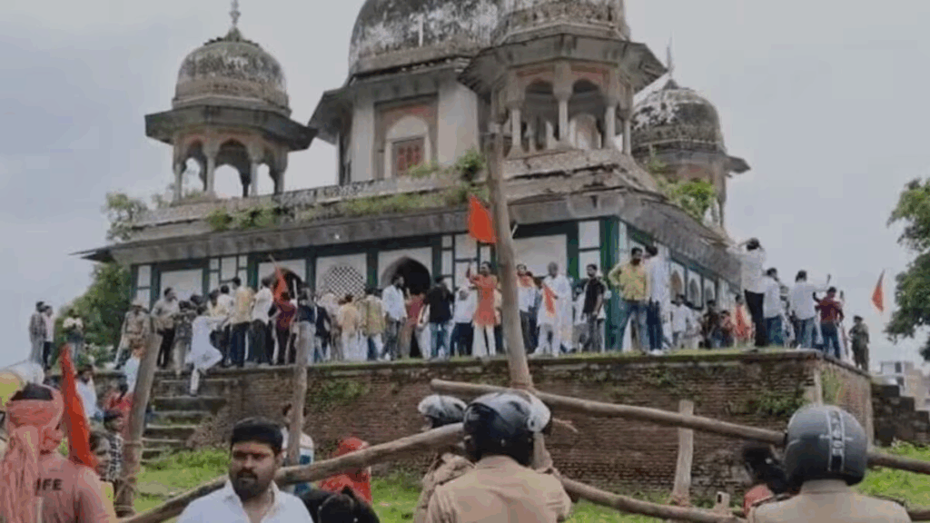 उत्तर प्रदेश में मकबरा मंदिर विवाद सोमवार को उग्र हो गया। मठ मंदिर संघर्ष समिति के बैनर तले भाजपा जिला अध्यक्ष मुखलाल पाल और पूर्व विधायक विक्रम सिंह की अगुवाई में भाजपाइयों ने डाक बंगले से मकबरा स्थल तक जुलूस निकाला और हनुमान चालीसा का पाठ किया। वहीं हिंदू महासभा के प्रांत उपाध्यक्ष मनोज त्रिवेदी 300 भक्तों के साथ मकबरा परिसर में प्रवेश कर आरती-पूजन कर बैठे। इसी दौरान मकबरे के अंदर बनी दो मजारों को तोड़ने की घटना हुई। मौके पर लगभग 2000 की संख्या