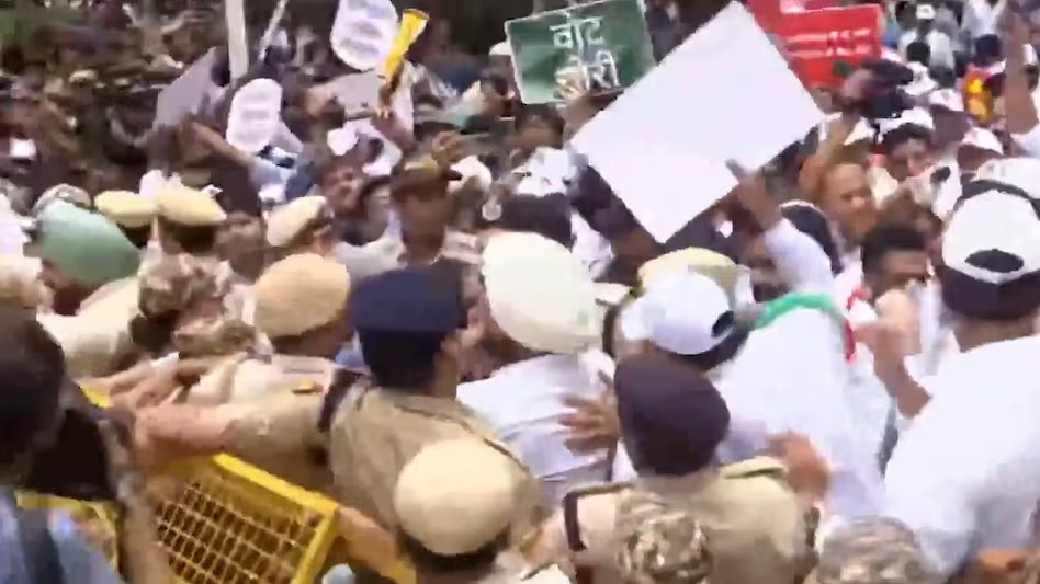 संसद से चुनाव आयोग तक मार्च करते हुए दिल्ली पुलिस ने INDIA ब्लॉक के कई नेताओं को हिरासत में लिया। हिरासत में लिए गए नेता संसद मार्ग पुलिस स्टेशन पहुंच चुके