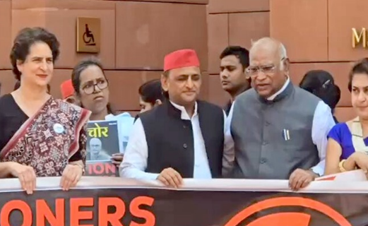 कांग्रेस अध्यक्ष मल्लिकार्जुन खड़गे ने चुनाव आयोग पर बड़ा हमला बोला है। उन्होंने कहा कि चुनाव आयोग अपनी संवैधानिक ज़िम्मेदारी से भाग नहीं सकता। खड़गे ने कहा कि INDIA गठबंधन ने फ्री एंड फेयर चुनाव पर ठोस प्रमाण के साथ गंभीर सवाल खड़े किए हैं, जिनकी जांच चुनाव आयोग को करनी चाहिए। लेकिन आयोग विपक्ष को डराने का काम कर रहा है। उन्होंने साफ कहा कि सड़क से संसद तक, वोट के अधिकार की लड़ाई जारी रहेगी। विपक्ष का आरोप है कि चुनाव आयोग जनता की आवाज़ को दबाने का काम कर रहा है।