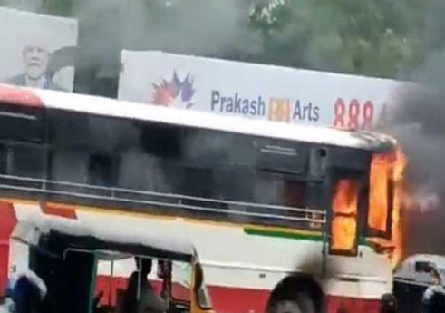 हैदराबाद के मेहदीपट्टनम इलाके में मंगलवार को एक TGSRTC बस में अचानक आग लग गई। बस में उस समय करीब 40 यात्री सवार थे। बस चालक ने सूझबूझ दिखाते हुए तुरंत बस को रोक दिया और सभी यात्रियों को सुरक्षित बाहर निकाल लिया। गनीमत रही कि किसी यात्री को चोट नहीं आई। सूचना मिलते ही दमकल विभाग मौके पर पहुंचा और आग पर काबू पाया। हालांकि बस का अगला हिस्सा पूरी तरह जलकर खाक हो गया। प्रारंभिक जांच में शॉर्ट सर्किट को आग लगने की वजह माना जा रहा है। घटना के बाद यात्रियों में अफरा-तफरी का माहौल बन गया।