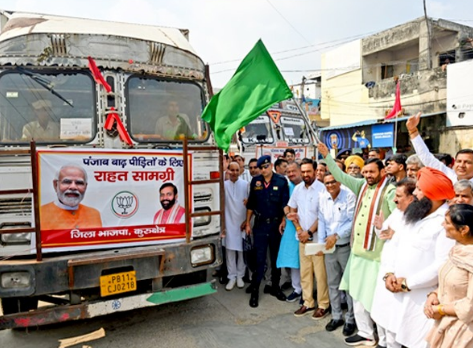 हरियाणा के मुख्यमंत्री नायब सिंह सैनी ने बुधवार को कुरुक्षेत्र से पंजाब के बाढ़ प्रभावित इलाकों के लिए राहत सामग्री से लदे 20 ट्रक रवाना किए। इन ट्रकों में खाद्यान्न, पानी, दवाइयां, मच्छरदानी, तिरपाल और पशुओं के लिए चारा सहित जरूरी सामान भेजा गया है। सीएम सैनी ने बताया कि पंजाब, हिमाचल और जम्मू-कश्मीर के लिए हरियाणा सरकार ने 5-5 करोड़ रुपये की सहायता दी है। उन्होंने X पर पोस्ट कर लिखा—“सेवा ही सर्वोपरि है।” उधर, प्रधानमंत्री नरेंद्र मोदी ने बाढ़ प्रभावित राज्यों के लिए 3,100 करोड़ रुपये की राहत पैकेज की घोषणा की है, जिसमें पंजाब को 1,600 करोड़ और हिमाचल को 1,500 करोड़ मिलेंगे। हरियाणा सरकार ने किसानों के लिए ई-क्षतिपूर्ति पोर्टल शुरू किया है। अब तक 3.24 लाख किसानों ने 19.22 लाख एकड़ फसल का नुकसान दर्ज कराया है। मृतकों के परिजनों को चार-चार लाख रुपये का मुआवजा दिया जा रहा है।