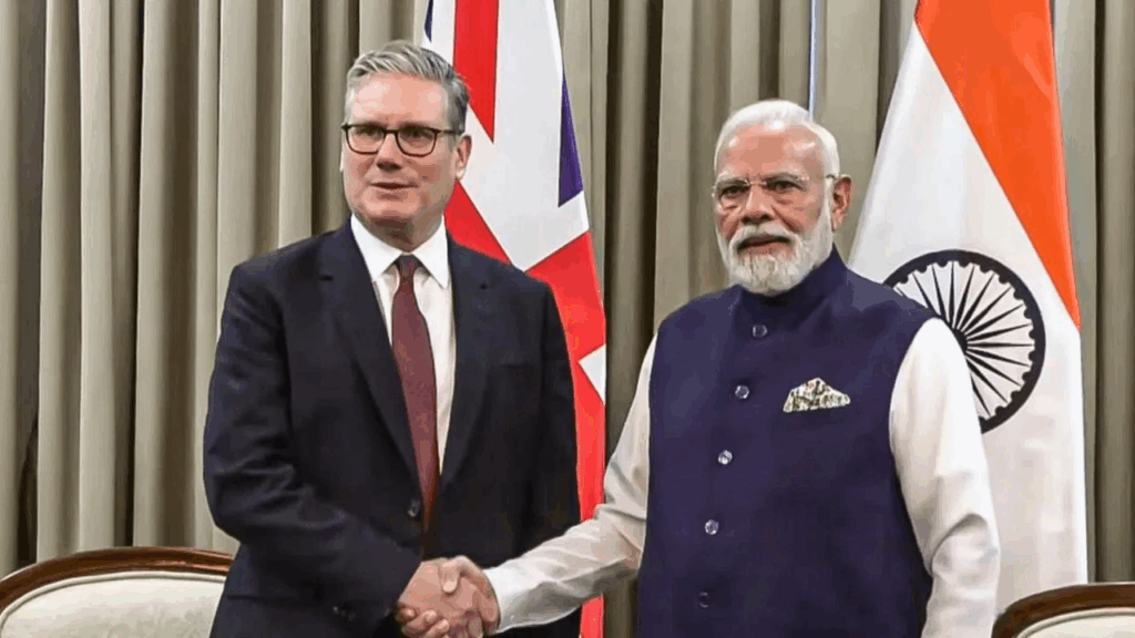प्रधानमंत्री नरेंद्र मोदी ने गुरुवार को ब्रिटेन के प्रधानमंत्री कीर स्टार्मर से मुलाकात की। दोनों नेताओं के बीच द्विपक्षीय वार्ता में व्यापार, सुरक्षा, तकनीक और शिक्षा जैसे अहम मुद्दों पर चर्चा हुई। बैठक के दौरान दोनों देशों ने ट्रेड एग्रीमेंट पर हस्ताक्षर किए। प्रधानमंत्री मोदी ने कहा कि भारत और ब्रिटेन के संबंधों में उल्लेखनीय प्रगति हुई है। इसी साल जुलाई में दोनों