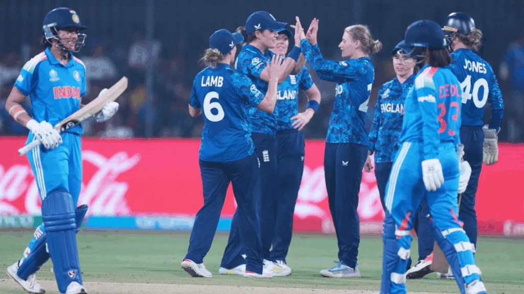 महिला वर्ल्ड कप 2025 में इंदौर के हाई स्कोरिंग मुकाबले में भारत को इंग्लैंड के हाथों 4 रन से हार का सामना करना पड़ा। टीम इंडिया की ऑलराउंडर दीप्ति शर्मा ने शानदार प्रदर्शन किया, उन्होंने 4 विकेट 51 रन देकर और 57 गेंदों पर 50 रन बनाए, लेकिन भारत जीत से चूक गया। इंग्लैंड ने इस जीत के साथ वर्ल्ड कप के सेमीफाइनल में जगह बना ली, जबकि भारतीय टीम की सेमीफाइनल की राह कठिन हो गई है। भारत के सामने टारगेट 289 रन का था। एक समय टीम जीत की राह पर थी, लेकिन आखिरी 53 गेंदों में 55 रन