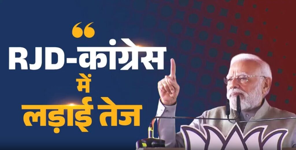 प्रधानमंत्री नरेंद्र मोदी ने बिहार में जनसभा को संबोधित करते हुए विपक्ष पर तीखा हमला बोला। उन्होंने कहा — “लालटेन वाले हों, पंजे वाले हों या उनके इंडी गठबंधन के साथी, ये हमेशा बिहार और बिहारियों का अपमान करते रहे हैं।” मोदी ने कहा कि जो लोग बिहार की धरती का अपमान करते हैं, वे अब चुनाव में वोट मांगने आ रहे हैं। उन्होंने इसे बिहार विरोधियों को बढ़ावा देने वाला कदम बताया और कहा कि जनता इस बार उन्हें करारा जवाब देगी।