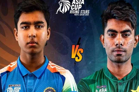 एशिया कप राइजिंग स्टार्स मुकाबले में 14 साल के युवा बल्लेबाज वैभव सूर्यवंशी ने पाकिस्तान ए के खिलाफ अपनी आक्रामक बल्लेबाजी से सबका ध्यान खींचा। बाएं हाथ के ओपनर ने पहली ही गेंद पर चौका मारकर अपना इरादा स्पष्ट कर दिया। पाकिस्तानी तेज गेंदबाज उबेद शाह के साथ वैभव की कई बार नोक-झोंक भी देखी गई, लेकिन तीसरे ओवर में वैभव ने शानदार पलटवार करते हुए कवर्स के ऊपर से चौका जमाया। वैभव की तेजतर्रार पारी 45 रन की रही, जिसमें उसने अपनी टीम को मजबूत शुरुआत दी। हालांकि, उनका आउट होना भारतीय पारी का टर्निंग पॉइंट साबित हुआ। 79/1 के स्कोर से टीम केवल 136 रन पर सिमट गई। पाकिस्तान ने यह लक्ष्य दो विकेट खोकर आसानी से हासिल कर लिया और सेमीफाइनल में अपनी जगह पक्की कर ली। वैभव सूर्यवंशी की परफॉर्मेंस सोशल मीडिया पर वायरल हो रही है और युवा बल्लेबाज की हिम्मत की खूब तारीफ हो रही है।