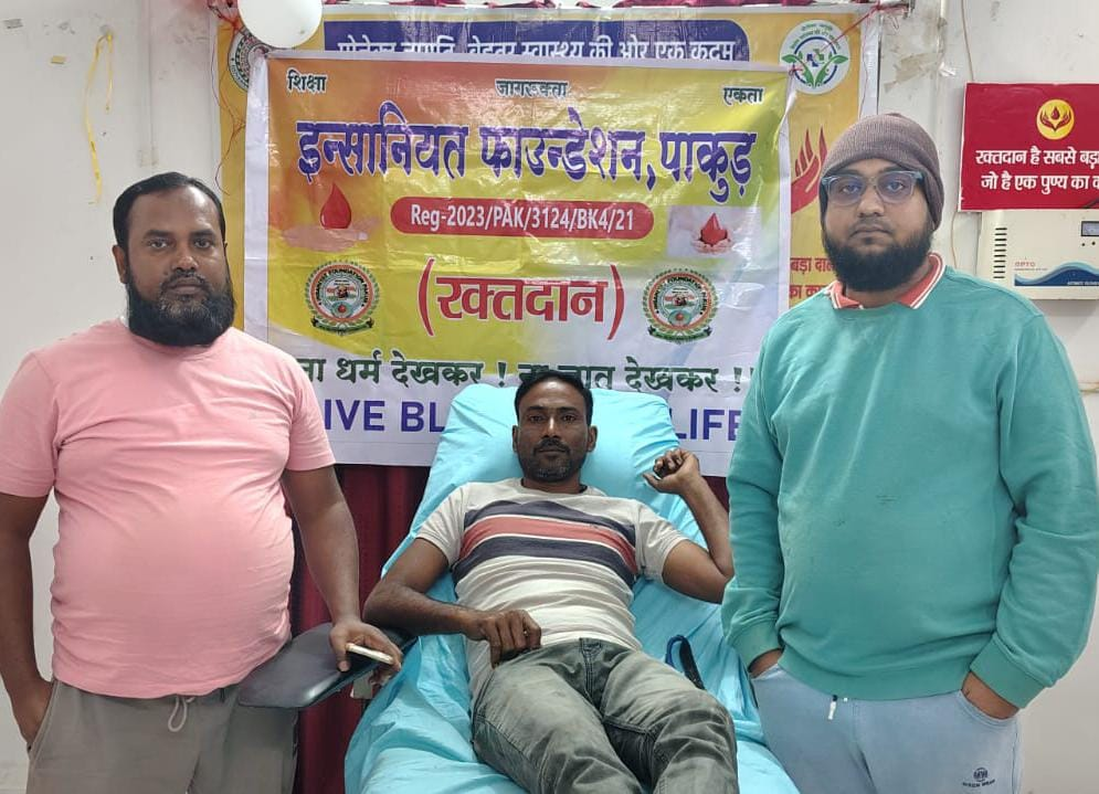 इंसानियत फाउंडेशन के सदस्य रक्तदान क्षेत्र मे अपना कार्य निस्वार्थ सेवा भाव से कर रहे है। झारखण्ड, बिहार एवं पश्चिम बंगाल मे रक्तदाता भेजकर पहुंचा रहे है लोगो मदद ताकि खून कि कमी से किसी असहाय जरूरतमंदो की जान ना जाये | धर्मोखनपारा के जनाब जमीरुद्दीन शेख का बेटा आसिम शेख को ए बी पॉजिटिव ब्लड का जरूरत था इंसानियत फाउंडेशन के बैनर तले सुहुबिल गांव के