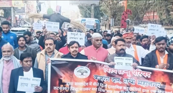 बांग्लादेश में हिंदू युवक दीपू चंद्र दास की निर्मम हत्या के विरोध में विश्व हिंदू परिषद और बजरंग दल के तत्वाधान में रांची महानगर में आक्रोश एवं विरोध प्रदर्शन आयोजित किया गया। इस कार्यक्रम में दुर्गा वाहिनी सहित अन्य हिंदू संगठनों के वरीय पदाधिकारी और ओजस्वी कार्यकर्ता भी शामिल हुए।