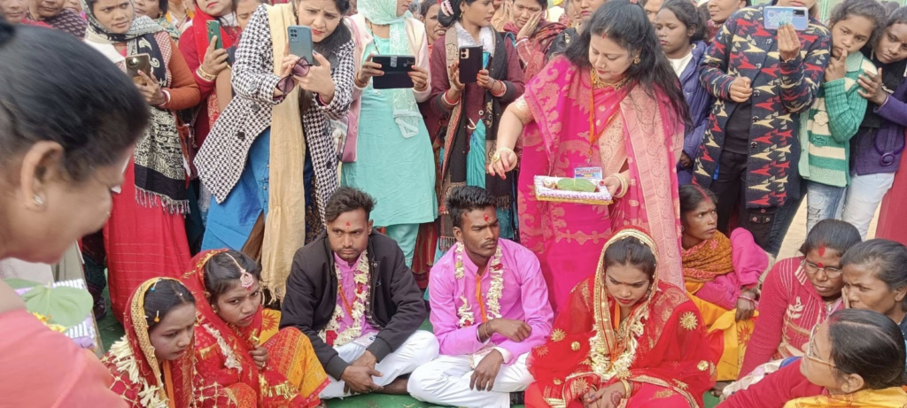 कार्यक्रम की सबसे खास बात यह रही कि हिंदू, मुस्लिम और ईसाई तीनों धर्मों के जोड़ों का विवाह उनके-अपने धार्मिक रीति-रिवाजों और परंपराओं के अनुसार संपन्न कराया गया। यह आयोजन सर्वधर्म समभाव और सामाजिक सौहार्द का उत्कृष्ट उदाहरण बनकर सामने आया। समिति के अध्यक्ष प्रदीप सिंह ने बताया कि दहेज-मुक्त विवाह के उद्देश्य से इस समारोह की शुरुआत 12 वर्ष पूर्व की गई थी। उन्होंने कहा कि यह पहल एक छोटे प्रयास के रूप में शुरू हुई थी, जो आज एक बड़े सामाजिक आंदोलन का रूप ले चुकी है और भविष्य में भी यह अभियान निरंतर जारी रहेगा। वहीं युवा संघर्ष मोर्चा के केंद्रीय संयोजक दिलीप सिंह ने कहा कि 12 वर्ष पहले रखी गई इस परंपरा को समाज और युवाओं का निरंतर सहयोग मिलता रहा है। प्रदीप सिंह के नेतृत्व में अनेक सामाजिक संगठनों की सहभागिता से यह आयोजन हर वर्ष और सशक्त होता जा रहा है। समारोह की शुरुआत सुबह 11 बजे हुई, जब टोटो पर सवार दूल्हों की भव्य बारात गाजे-बाजे और आतिशबाजी के साथ निकाली गई। बारात देखने के लिए बड़ी संख्या में लोग उमड़ पड़े और पूरा माहौल उत्सवमय हो गया। कुल मिलाकर, यह सामूहिक विवाह समारोह न केवल एक वैवाहिक आयोजन रहा, बल्कि दहेज-मुक्त समाज, सामाजिक एकता और सर्वधर्म सद्भाव का एक सशक्त और प्रेरणादायी संदेश बनकर उभरा।