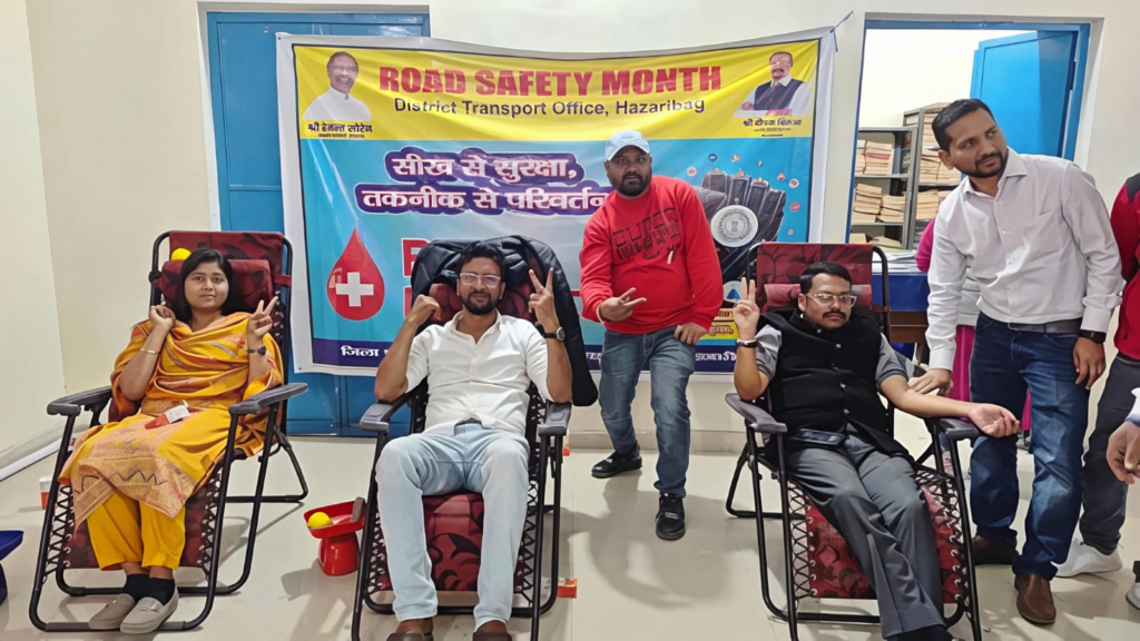 हजारीबाग। जिला कार्यालय में आज ‘सड़क सुरक्षा माह 2026’ के तहत भव्य रक्तदान शिविर लगाया गया। जिला परिवहन पदाधिकारी (DTO) ने स्वयं रक्तदान कर अभियान की शुरुआत की, जिसके बाद कार्यालय के अन्य कर्मियों और युवाओं ने भी बढ़-चढ़कर हिस्सा लिया। मुख्य बिंदु: उद्देश्य: सड़क दुर्घटना पीड़ितों की सहायता हेतु रक्त कोष को समृद्ध करना। नेतृत्व: जिला परिवहन पदाधिकारी, हजारीबाग। सहभागिता: परिवहन
