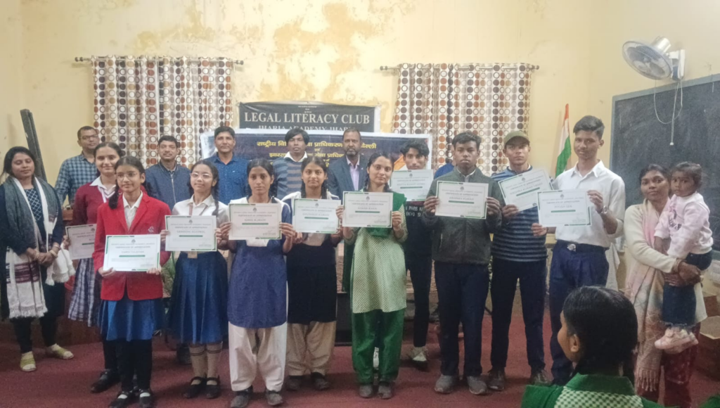 झरिया : नालसा व झालसा के तत्वाधान में प्रधान जिला एवं सत्र न्यायाधीश सह अध्यक्ष जिला विधिक सेवा प्राधिकरण बाल कृष्ण तिवारी के निर्देश पर जिले के सभी प्रखंडों एवं पंचायत में नालसा आशा योजना के तहत जागरूकता कार्यक्रम चलाई जा रही है इस बाबत जानकारी देते हुए सचिव डालसा मयंक तुषार टोपनो ने बताया कि धनबाद जिले को बाल विवाह मुक्त बनाने हेतु नालसा द्वारा 100 दिवसीय विशेष अभियान चलाया जा रहा है जिसमें डालसा की टीम जागरूकता के लिए दूर सुधार ग्रामीण इलाकों में जहां पर की शिक्षा एवं गरीबों के अभाव में अपने छोटे बच्चों को विवाह कर उनके भविष्य को और अंधेरे में धकेल देते है इस कड़ी में आज झरिया एकैडमी स्कूल में छात्र एवं छात्राओं के बीच पेंटिंग , निबंध , भाषण प्रतियोगिता कराकर छात्र एवं छात्राओं को प्रशस्ति पत्र देकर सम्मानित किया गया पेंटिंग प्रतियोगिता में प्रथम स्थान वंशी तुलसियान , पीयूष सेन