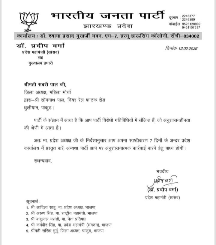 नगर निकाय चुनाव में बतौर अध्यक्ष पद पर अपनी दावेदारी पेश करने वाली शबरी पाल से भारतीय जनता पार्टी ने लिखित रूप में नोटिस जारी किया है। बताते चलें कि इस बार के नगर निकाय चुनाव में भाजपा के कई नेता व कार्यकर्ताओं ने पार्टी द्वारा समर्थित उम्मीदवार के होने के बाद भी नामांकन किया है। इसमें शबरी पाल का नाम सबसे उपर है। लिहाजा पार्टी ने शबरी पाल से लिखित रुप में सात दिनों के अंदर अपना ज़बाब देने को कहा है। पार्टी के प्रदेश महामंत्री प्रदीप वर्मा की ओर से जारी पत्र में शबरी पाल के इस कदम को अनुशासनहीनता बताया गया है।