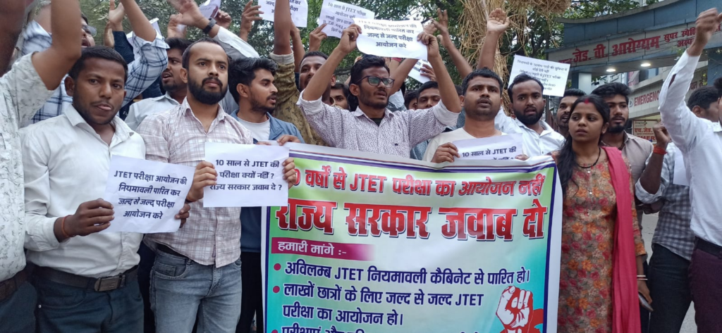 लापरवाही” करार दिया है । अदालत ने सरकार को निर्देश दिया था कि 31 मार्च 2026 तक हर हाल में JTET का आयोजन सुनिश्चित किया जाए।लेकिन अब तक इस पर सरकार ने कोई कदम नहीं उठाया,सरकार कोर्ट के आदेश के प्रति भी उदासीन है। छात्रों ने चेतावनी दी है कि यदि सरकार जल्द ही परीक्षा की तिथि घोषित नहीं करती है, तो यह आंदोलन केवल पुतला दहन तक सीमित नहीं रहेगा, विधानसभा सत्र के दौरान राज्य स्तरीय आंदोलन होगा। आज के कार्यक्रम में जीवन कुमार,रविंद्र कुमार, राधे मेहता,विक्रम कुमार,मिथिलेश कुमार,देव कुमार,तथा दर्जनों छात्र उपस्थित थे।