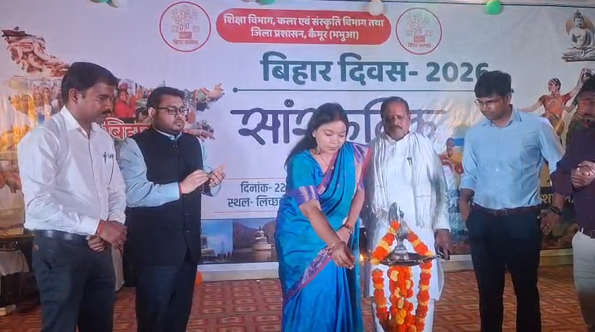 भभुआ के लिच्छवी भवन में बिहार दिवस के मौके पर भव्य सांस्कृतिक कार्यक्रम का आयोजन किया गया। कार्यक्रम का उद्घाटन जिला पदाधिकारी नितिन कुमार सिंह, विधायक भरत बिंद और विधायिका संगीता कुमारी समेत अन्य अधिकारियों ने दीप प्रज्वलित कर किया। कार्यक्रम की शुरुआत में स्थानीय कलाकार दूनमुन रसिया ने “हम बिहारी हैं जी” गीत से ऐसा माहौल बनाया कि पूरा सभागार तालियों से गूंज उठा। इसके बाद बिहार