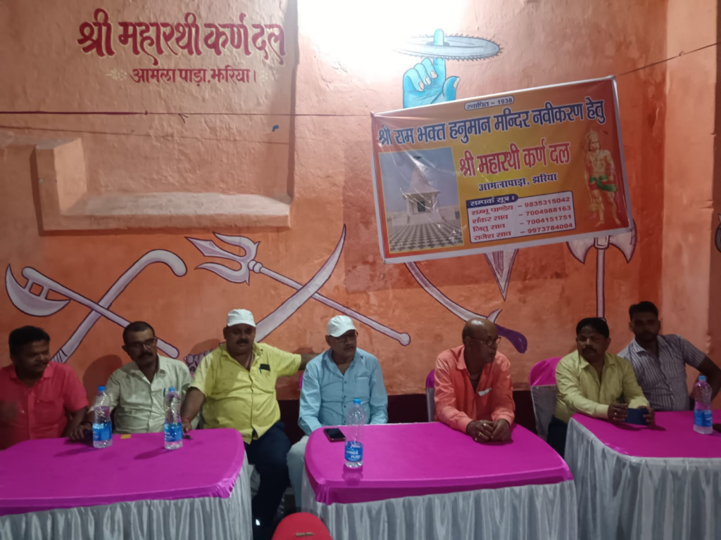 श्री महारथी कर्दल, अमलापाड़ा, झरिया में आज अपराह्न एक बैठक आयोजित की गई। इस बैठक में मंदिर के नवनिर्माण को लेकर विस्तृत चर्चा की गई तथा एक शुभ मुहूर्त निर्धारित कर निर्माण कार्य प्रारंभ करने का निर्णय लिया गया। बैठक में समिति के निम्नलिखित सदस्य उपस्थित रहे: अध्यक्ष — शंभू पांडे सचिव — शंकर साव सदस्य — विनय सिंह मनोज रवानी रंजीत साव जीतू शाह राजेश साहू विकी साव सभी सदस्यों ने मंदिर