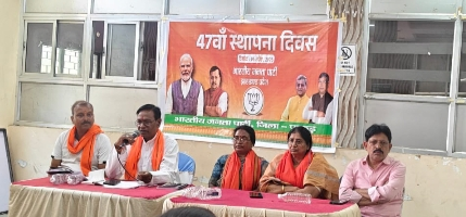 प्रदेश के निर्देशानुसार 47 वां भाजपा स्थापना दिवस जिला में आयोजित करने को लेकर भाजपा जिलाध्यक्ष सरिता मुर्मू की अध्यक्षता में भाजपा की जिला स्तरीय बैठक आयोजित हुई। बैठक शहर के अटल चौक पर स्थापित अटल बिहारी वाजपेयी की प्रतिमा पर माल्यार्पण कर उन्हें पुष्पांजलि देने, भाजपा जिलाध्यक्ष के द्वारा नगर में भाजपा के झंडे का ध्वजारोहण कर एवं जनसंघ के नेतागण क्रमशः डॉ श्यामा प्रसाद मुखर्जी, पंडित दीनदयाल के प्रतिमा पर माल्यार्पण कर श्रद्धांजलि देने का निर्णय लिया गया। संध्या प्रहर दीपोत्सव मनाया जाएगा। जिलाध्यक्ष ने कहा कि भाजपा स्थापना दिवस का कार्यक्रम मंडल सहित बूथ स्तर पर भी आयोजित किया