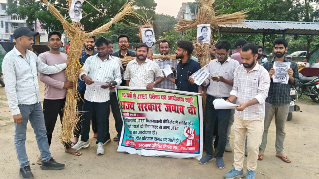 महाशय विगत कल 15 अप्रैल को राज्य कैबिनेट द्वारा JTET नियमावली को पुनः वापस कर दिए जाने के फैसले के बाद झारखंड के लाखों प्रशिक्षित छात्रों में भारी आक्रोश व्याप्त है। झारखंड प्रशिक्षित शिक्षक संघ ने सरकार के इस कदम को छात्रों के भविष्य के साथ क्रूर मजाक करार दिया है। छात्रों की भावना और अदालत के आदेश की अनदेखी का आरोप संघ के प्रतिनिधियों ने कहा कि झारखंड शिक्षक पात्रता परीक्षा (JTET) के लिए अभ्यर्थी पिछले 10 वर्षों से प्रतीक्षारत हैं। इसके लिए जिला स्तर से लेकर राज्य स्तर तक बड़े आंदोलन किए गए। माननीय उच्च न्यायालय ने भी परीक्षा आयोजन के लिए 31 मार्च तक की समय सीमा निर्धारित की थी, परंतु राज्य सरकार ने इस पर कोई ठोस पहल नहीं की। छात्र आंदोलन के भारी दबाव में सरकार ने आनन-फानन में नियमावली और पाठ्यक्रम तो जारी किया, लेकिन अब इसे कैबिनेट से वापस लेकर छात्रों को अधर में लटका दिया गया है। हजारीबाग में पुतला दहन और विरोध मार्च सरकार की नीतियों के खिलाफ आज हजारीबाग के गांधी मैदान से डिस्ट्रिक्ट मोड़ तक विशाल विरोध मार्च निकाला गया। इस दौरान छात्रों ने मुख्यमंत्री
