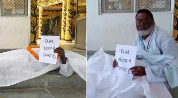 उत्तर प्रदेश के बस्ती से सिस्टम की बड़ी लापरवाही का चौंकाने वाला मामला सामने आया है। यहां एक बुजुर्ग व्यक्ति को सरकारी रिकॉर्ड में मृत घोषित कर दिया गया, जबकि वह पूरी तरह जीवित हैं। अपनी पहचान और हक के लिए उन्होंने अनोखा विरोध किया। जिला अधिकारी कार्यालय के बाहर वह कफन ओढ़कर लेट गए, गले में माला डाली और फिर अचानक उठकर हाथ में एक तख्ती दिखाने लगे, जिस पर लिखा था— “डीएम साहब, मैं जिंदा हूं।” बताया जा रहा है कि भूमि रिकॉर्ड में गलती के कारण उन्हें मृत दर्ज कर दिया गया, जिससे उन्हें सरकारी सुविधाओं और अधिकारों से वंचित होना पड़ रहा है।
